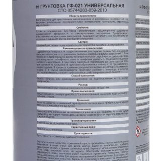 Un apprêt universel est utilisé pour le traitement du métal, du bois, du contreplaqué et du plastique. La composition est nécessaire pour préparer la surface à une finition ultérieure ou à une protection. Primer GF 021 protège le matériau de l'humidité, de la rouille, augmente l'adhérence des couches suivantes à la base.