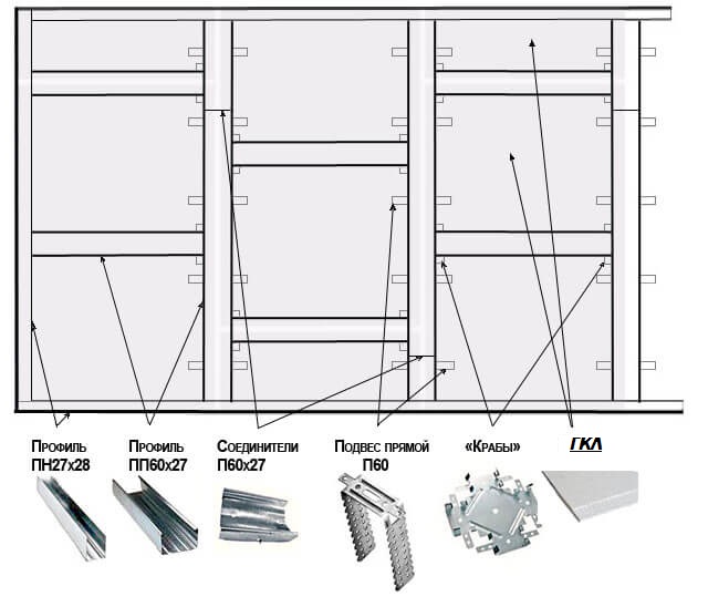 Profil de cadre sous les cloisons sèches installées par incréments de 60 cm, et les supports sous les plaques de plâtre sont placés tous les 60,5 cm pour assurer l'écart de montage entre les bords. Il est nécessaire pour un scellement de haute qualité des dalles afin de fournir une résistance suffisante correspondant au matériau de base.
