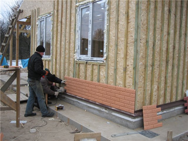 - Recouvrez le cadre de contreplaqué imperméable ou d'OSB. Laisser des joints de dilatation de 2 mm, qui sont remplis de mastic. La fixation peut être effectuée avec des clous ou des vis autotaraudeuses.