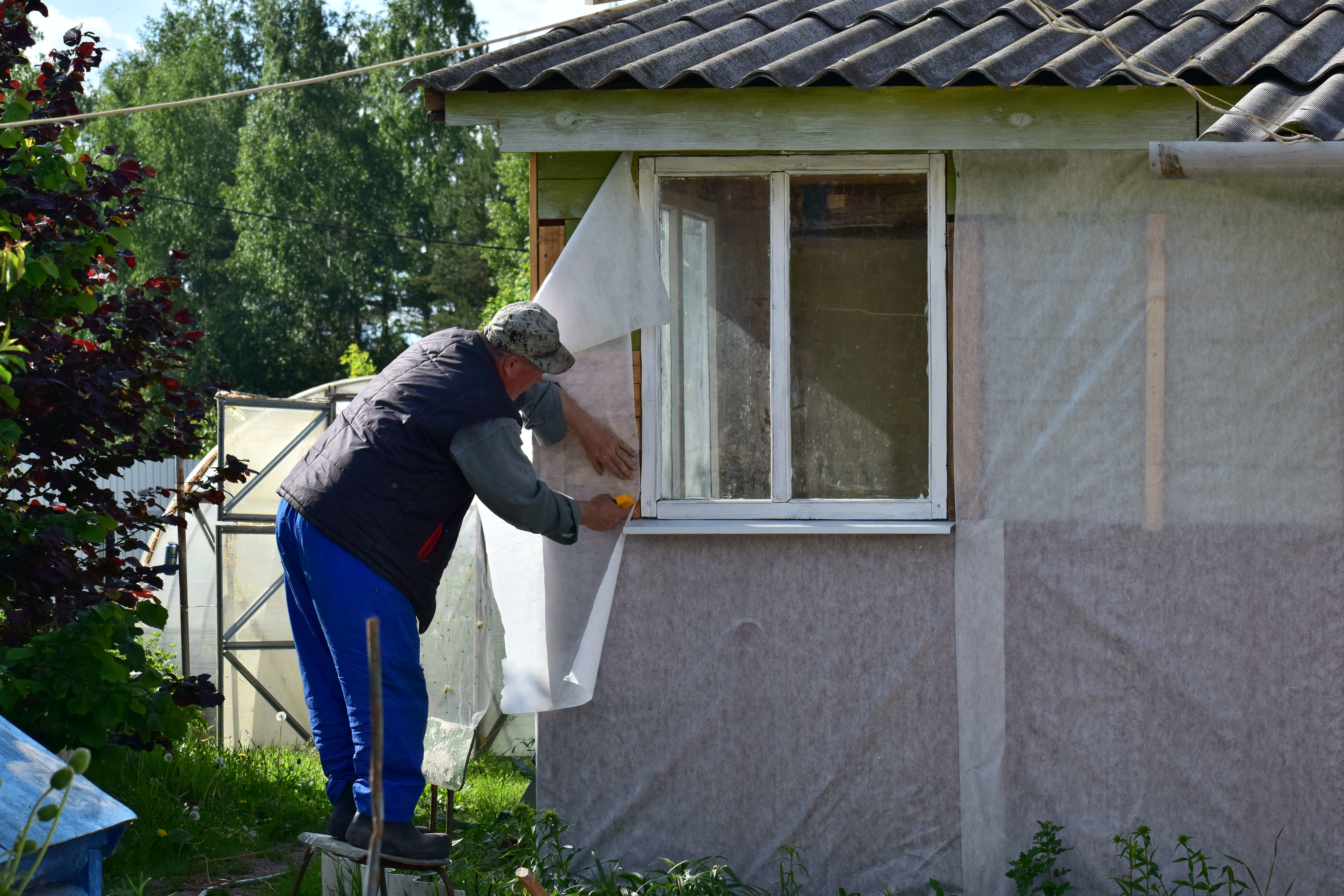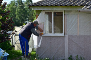 - L'isolation est fermée par une hydro-barrière. Le film est posé horizontalement ou verticalement, nécessairement avec un chevauchement et fixé avec une agrafeuse. Si le cadre est en bois, l'imperméabilisation recouvre le cadre et un contre-treillis est placé sur le dessus pour installer le revêtement.