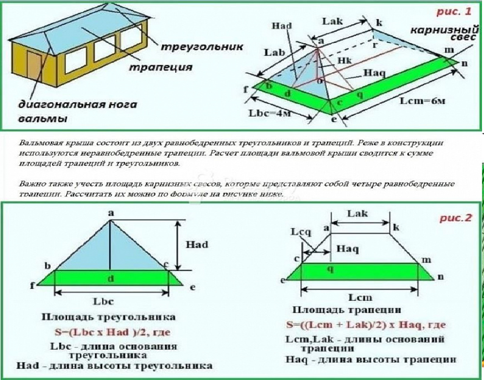 Cette méthode est utilisée pour calculer le volume de matériau et pour les structures plus complexes : en croupe, demi-croupe, toit en croupe et même toit en mansarde. Pour les options symétriques - hipped, il suffit de multiplier le montant calculé par 4. Dans le reste, la quantité de matériau pour la pente courte et longue est calculée séparément.