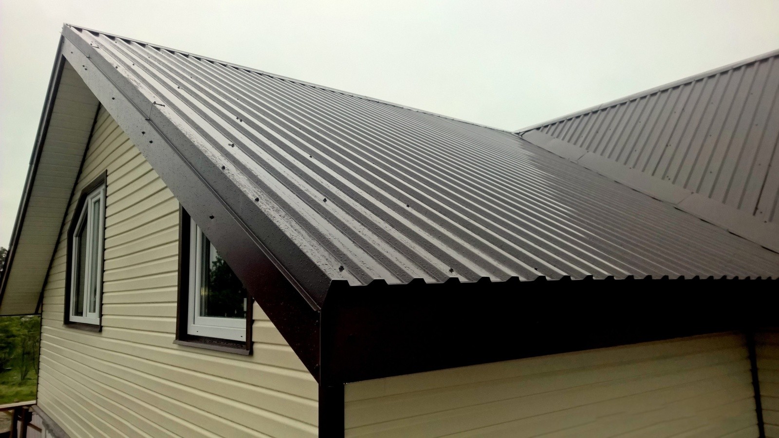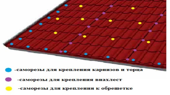 Les tôles profilées doivent être fixées de bas en haut avec un chevauchement en largeur et en hauteur. La quantité de chevauchement est déterminée par la pente de la pente, mais elle ne peut être inférieure à une arête sur les côtés et à 10 cm verticalement. Pour fixer la tôle profilée au toit, une quincaillerie spéciale est utilisée pour garantir que le revêtement est fermement pressé contre la caisse et son libre mouvement lors de la dilatation thermique.