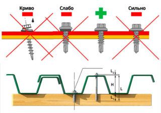 La longueur de la partie filetée des vis n'est pas moins importante pour assurer la solidité du toit. Il doit être 3 à 5 mm plus grand que la base dans laquelle ils sont vissés, plus l'épaisseur de la feuille et de la rondelle à l'état comprimé. Une paroi du tube profilé et toute l'épaisseur de la bande de lattage sont prises en compte. La perceuse n'est pas prise en compte, car elle ne remplit pas de fonction de maintien.