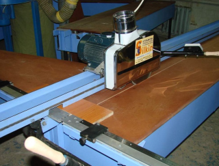 Le sciage des panneaux de particules sans copeaux permet divers appareils supplémentaires. Par exemple, certains modèles ont deux lames de scie : le premier, de petit diamètre, coupe à travers la couche laminée de surface, et le principal fait une coupe complète.