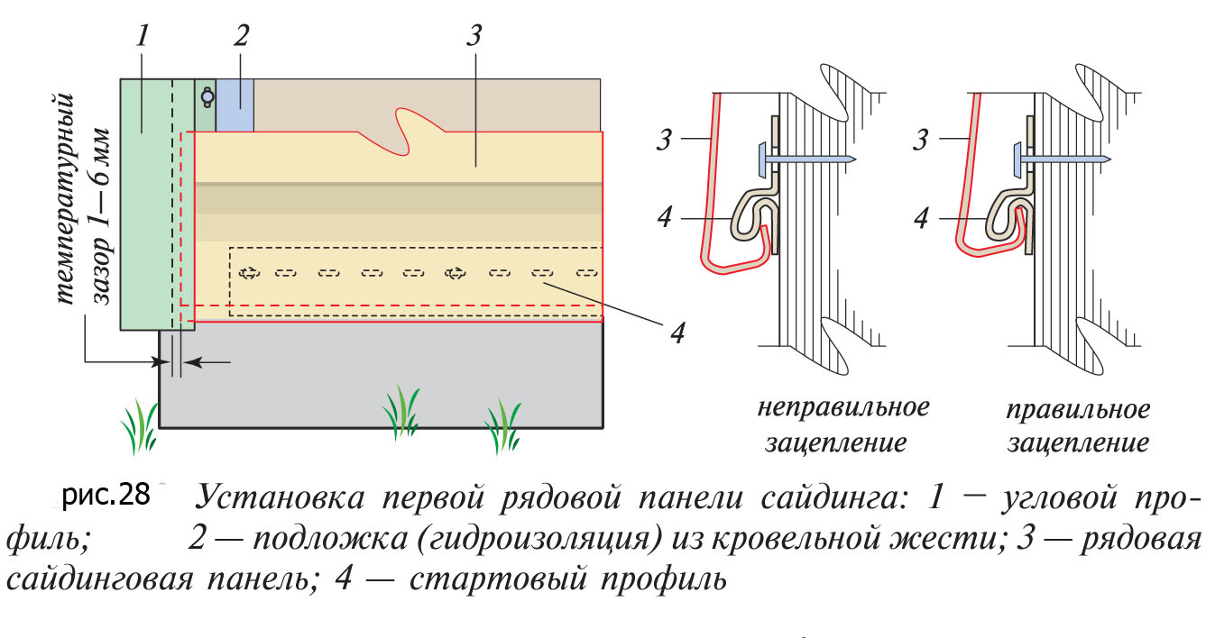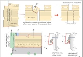 - Un certain écart de température est réalisé entre l'élément de guidage du revêtement et le panneau lui-même, en plus d'observer la taille du chevauchement. Lorsqu'il est installé en été, un tel espace est fait de 5 à 6 mm, en hiver par temps de gel, il laisse jusqu'à 15 mm. Cela aidera à maintenir l'intégrité du joint entre les rangées de panneaux.