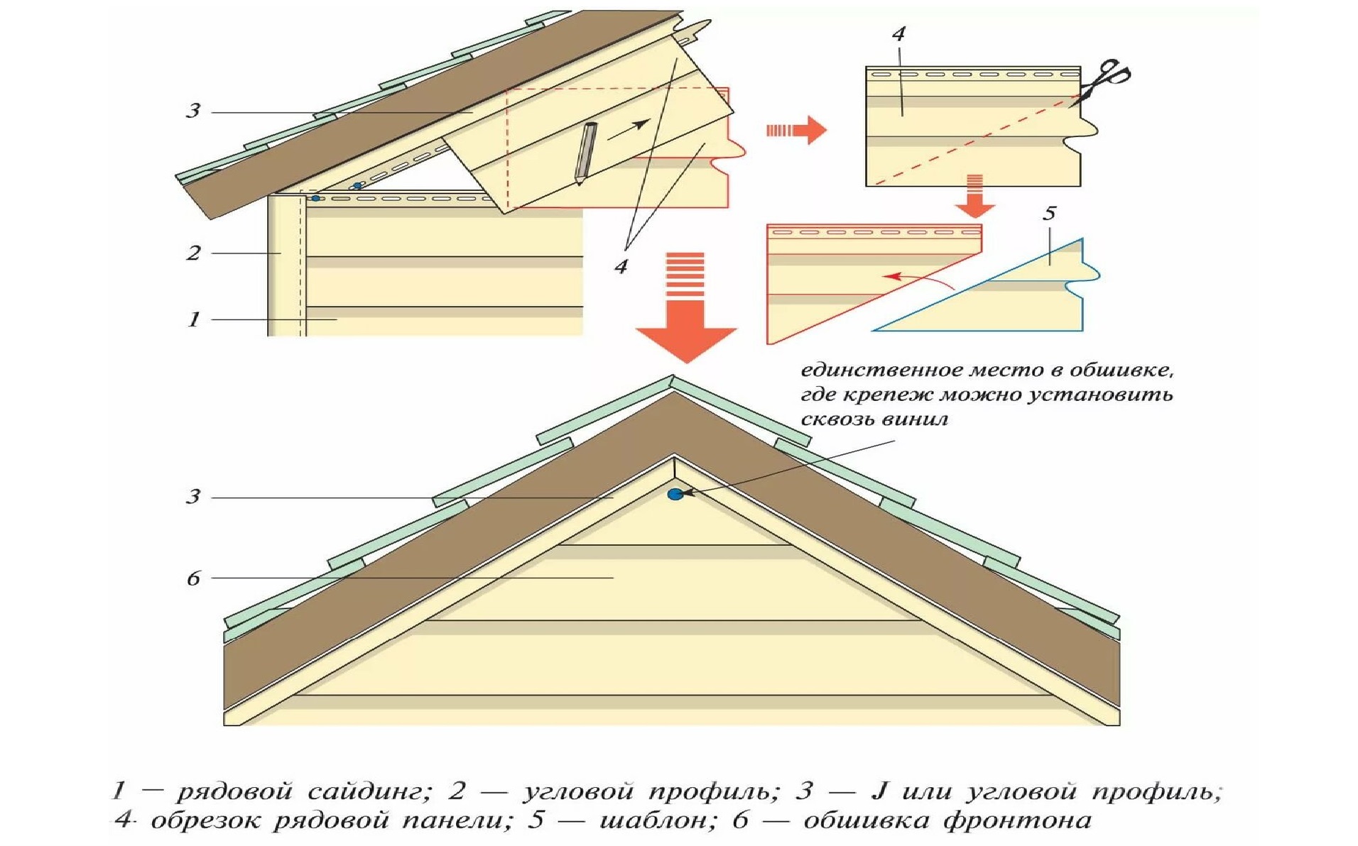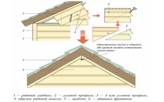 Un profilé en J est placé sur les côtés inclinés ; pour plus de fiabilité, il est fixé après 200 - 300 mm. Si des panneaux courts sont utilisés, ils sont pré-posés les uns sur les autres pour assurer l'assemblage. Coupez ensuite en biais par rapport à la forme du fronton. Toutes les 2 bandes suivantes sont mesurées après l'installation des bandes sous-jacentes.