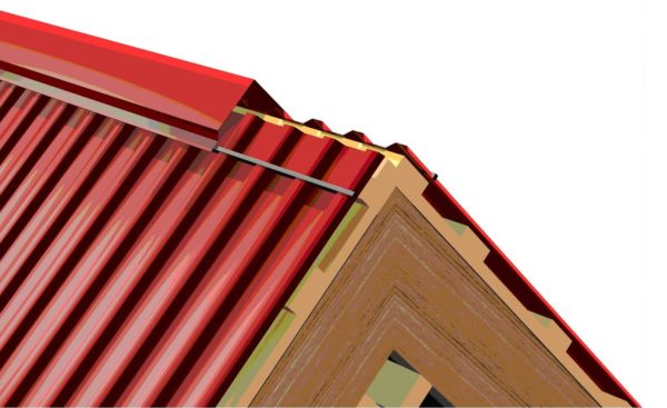 Lors de l'installation d'un toit à pignon simple, une arête triangulaire ordinaire est placée sur la barre de support du revêtement. Les fentes sont scellées avec du ruban d'étanchéité. Dans ce cas, les tôles profilées ne s'emboîtent pas et l'espace résultant est suffisant pour améliorer l'évacuation de l'air.