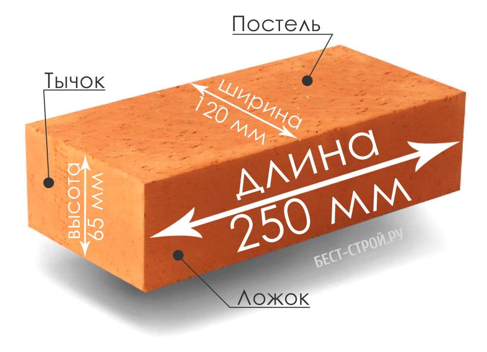 Les côtés de la brique sont nommés pour plus de commodité. Lit ils appellent la partie de travail, qui est posée parallèlement à la base de maçonnerie. Cuillère - c'est le côté long latéral du produit. Coup - face avant.