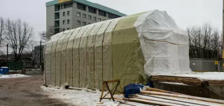 Dans la zone du chantier de construction qu'ils construisent structure de cadre en bois ou en métal pour protéger le site des précipitations et du froid. Des éléments chauffants sont installés à l'intérieur pour augmenter la température interne.