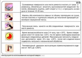 Les plombiers utilisent la méthode de soudage à froid pour éliminer les fuites batteries, égouts et conduites d'eau. La composition fonctionne bien lors de l'installation de citernes, du raccordement de machines à laver, d'éviers, de baignoires et de douches (raccords de tuyauterie). Le propriétaire des locaux résout de manière indépendante le problème de la restauration sans l'intervention de spécialistes.