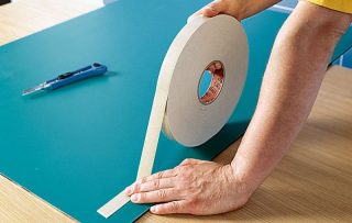 - Application ruban adhésif double face. Les rubans sont collés verticalement avec des lignes discontinues et continues afin qu'elles coïncident avec les bords des feuilles, de sorte qu'elles effectuent un marquage préliminaire. Les bandes intermittentes sont placées sur 70 mm de long avec un pas de 200 mm et la distance entre les bandes verticales ne dépasse pas 200 mm.