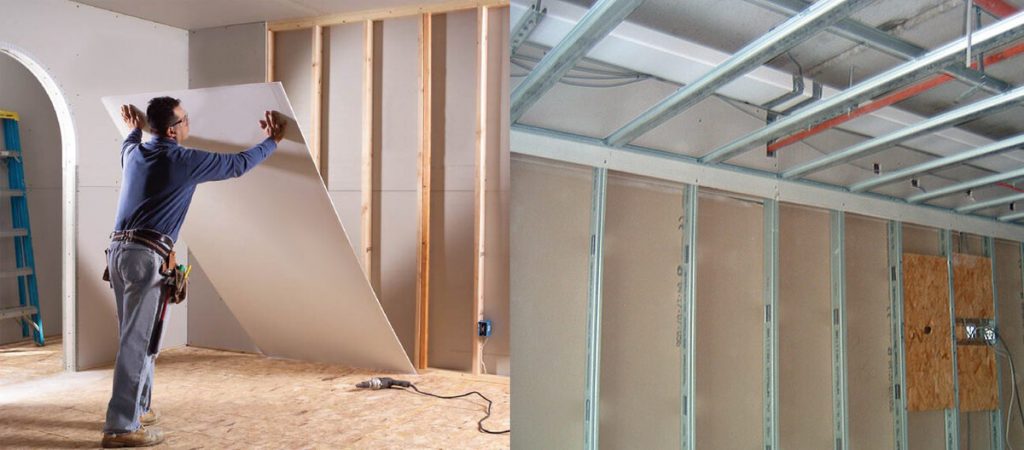 - Les plaques de plâtre sont placées verticalement, tandis que les bords doivent s'adapter exactement sur la bande. Ajustez les feuilles avec une légère pression.
