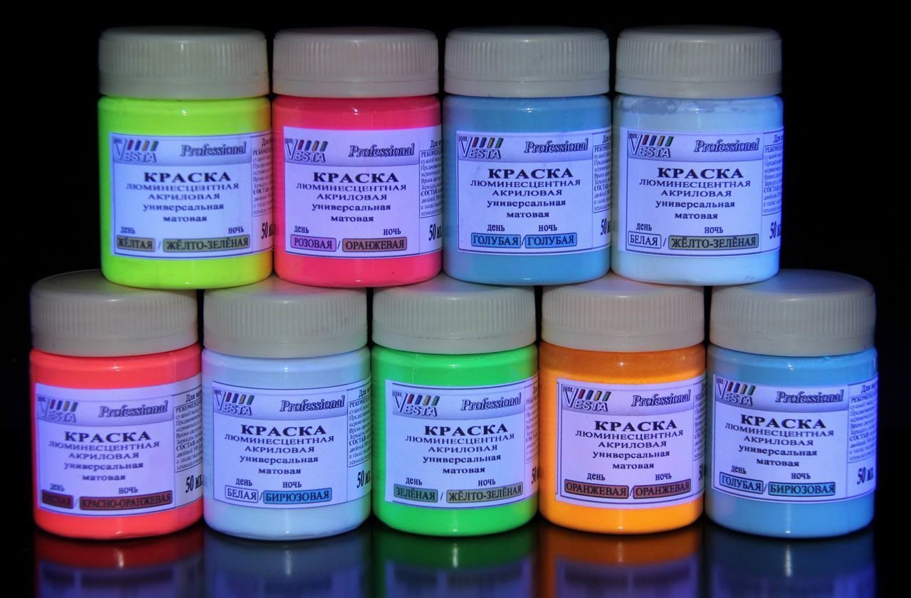 Peintures fluorescentes et luminescentes se composent de phosphores - des matériaux pouvant réagir à la lumière du soleil et aux ultraviolets. Après l'accumulation de rayons, ils acquièrent un éclat brillant et un volume.