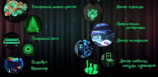 - Encrer... Ils sont utilisés dans l'impression intérieure, dans la création de produits publicitaires, dans l'art et le design. Vous pouvez utiliser des encres fluorescentes uniquement UV.