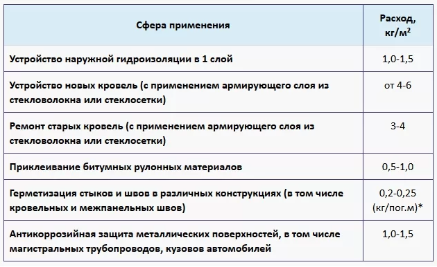Pour un carré dans une couche, le matériau froid est consommé dans un solvant 1 - 2 kg, le mastic froid bitume sur l'eau - 1,5 - 2 kg, la masse chaude ira 2 kg. Le carré de l'enduit est multiplié par la consommation de mastic, puis multiplié par le nombre de couches.