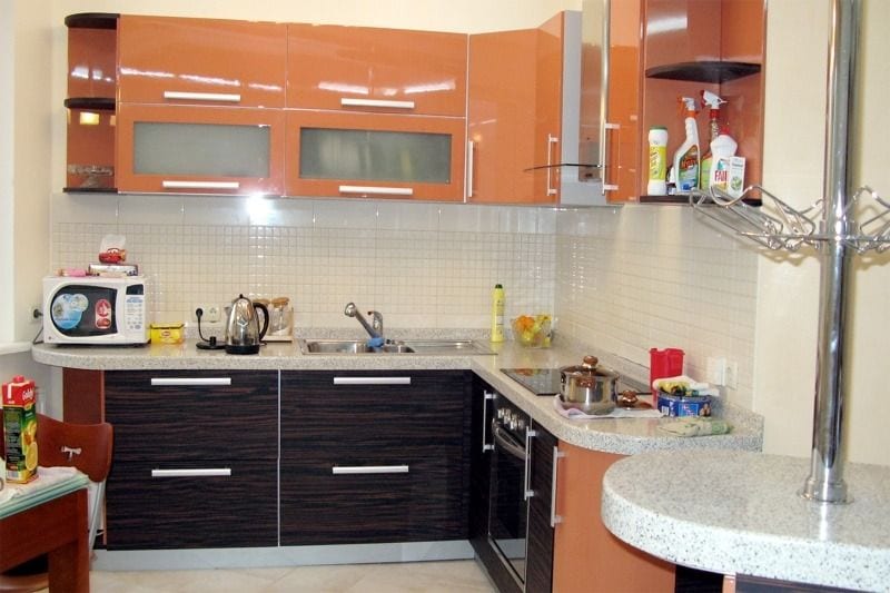 - Pour la cuisine. De la vapeur humide est présente dans la pièce, l'air se réchauffe pendant la cuisson. Un liquide chaud, de l'eau, de la graisse pénètre à la surface des murs de la cuisine, des plans de travail. Pour la cuisine, choisissez le matériau avec les meilleurs indicateurs de résistance aux influences agressives. Les panneaux MDF conviennent et les panneaux de particules sont placés comme sous-plancher. Les extrémités des meubles sont collées avec un film plastique en polychlorure de vinyle.
