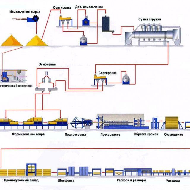 Les matières premières préparées sont triées, séché à une teneur en humidité de 12 - 15%, mélangé avec des additifs, des modificateurs, en forme une bande. Le produit semi-fini résultant est pressé dans des chambres thermiques.
