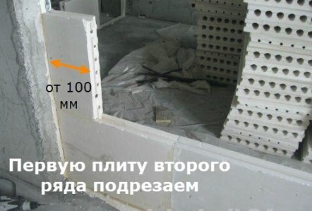 Les blocs de plâtre doivent être montés rainure vers le haut ou vers le bas... La première option est considérée comme la plus correcte, car la solution est uniformément répartie sur la surface lorsque les éléments entrent en contact. Avant d'installer la première rangée, vous devez couper l'arête inférieure une scie à métaux avec une grande dent.