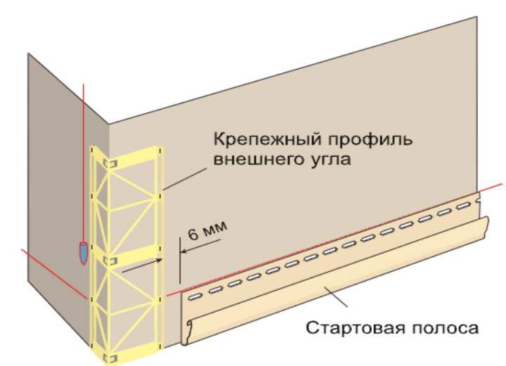 - Un profil spécial est placé pour le coin intérieur ou barre j-trim... L'élément est fixé de sorte qu'un écart de 6 mm subsiste entre son extrémité inférieure et le profilé.