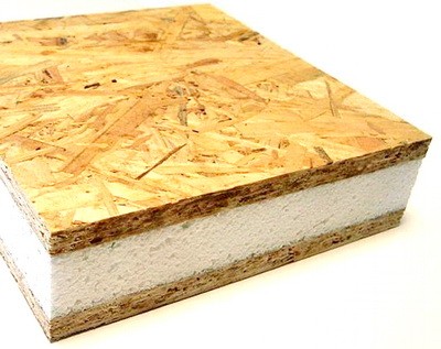 - panneaux OSB également utilisé pour couvrir les panneaux à trois couches. Le matériau est un copeau comprimé à haute pression avec l'utilisation de liants.