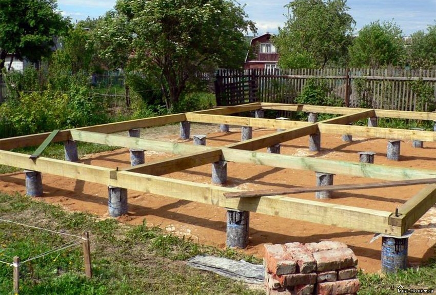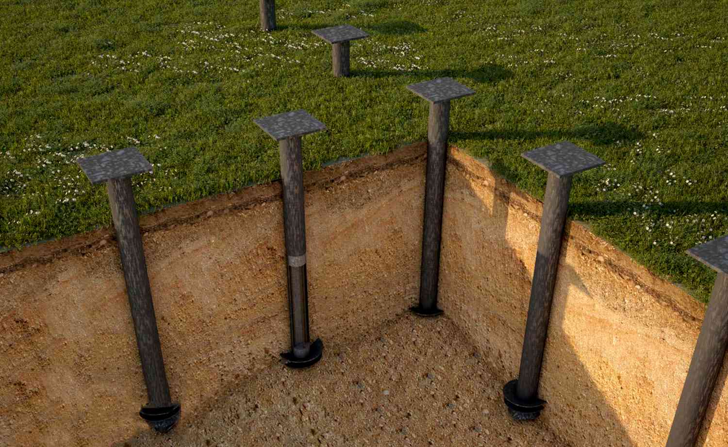 - Pile - recommandé pour les sols instables. Les pieux en fer sont enfoncés ou vissés dans le sol à la profondeur requise. Au sommet, les pieux sont reliés à une base en bois, ce qui rend cette option encore moins chère.