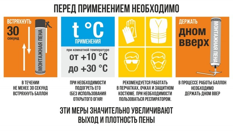 Si le travail est effectué en chambre froide, la mousse doit être chauffée un peu (la température recommandée est indiquée sur l'emballage). Cela peut être fait en plaçant le ballon dans de l'eau chaude (20-25 degrés). Une autre option est de le conserver plusieurs heures dans une pièce chauffée.