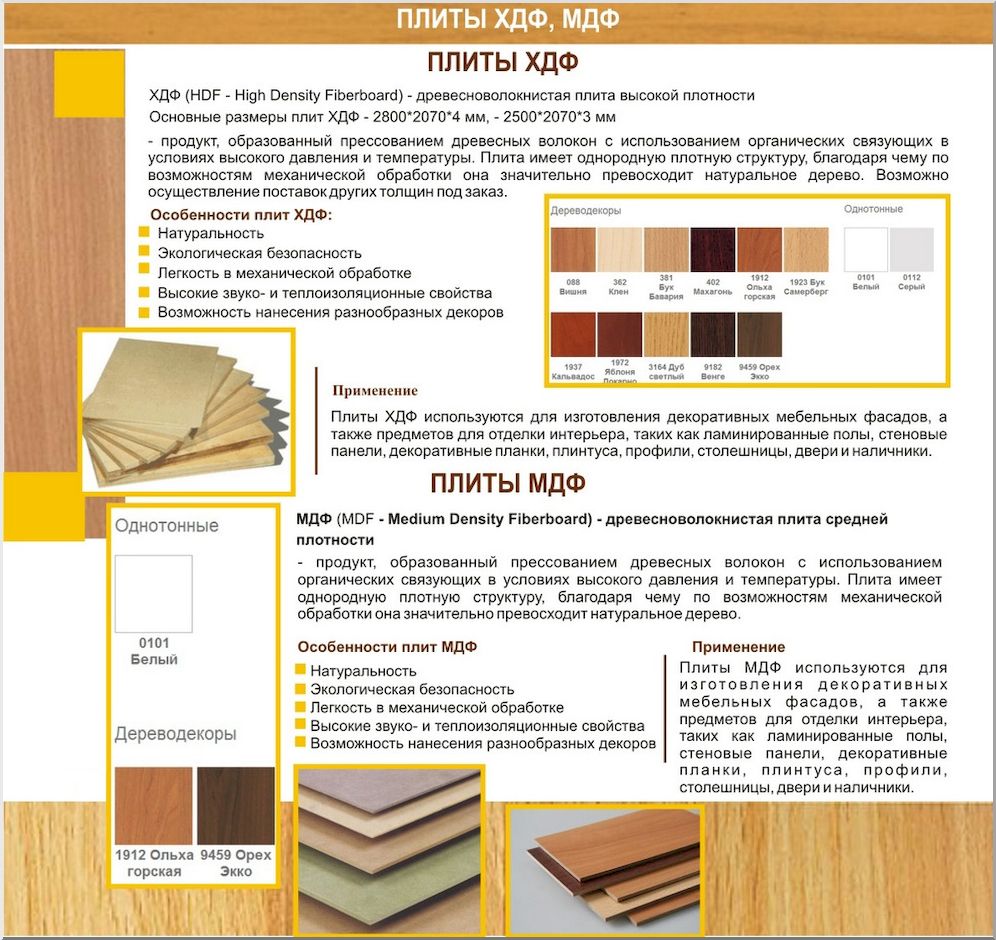 Les matériaux entrent dans une catégorie générale, mais ils forment des groupes différents. Spécialistes panneaux de fibres de bois peints et vernis appelés panneaux durs ou avec un autre type de revêtement (film laminé, placage, plastique).