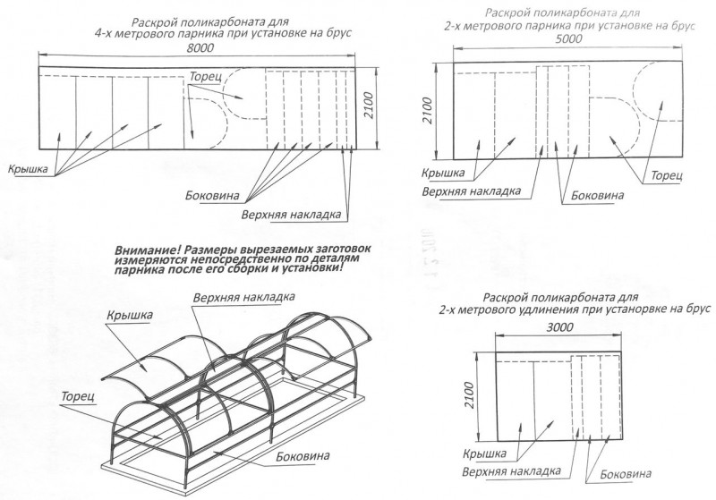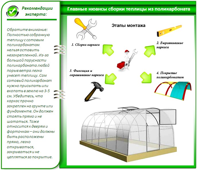 Les serres en polycarbonate avec un dessus inclinable ou ouvrant sont assez faciles à assembler. Pour mener à bien la construction, vous devez suivre le dessin et agir selon le schéma.