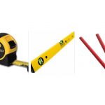 - ruban à mesurer, ciseaux en métal, niveau du bâtiment;