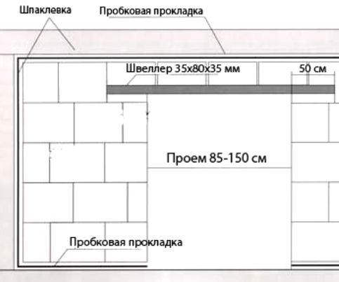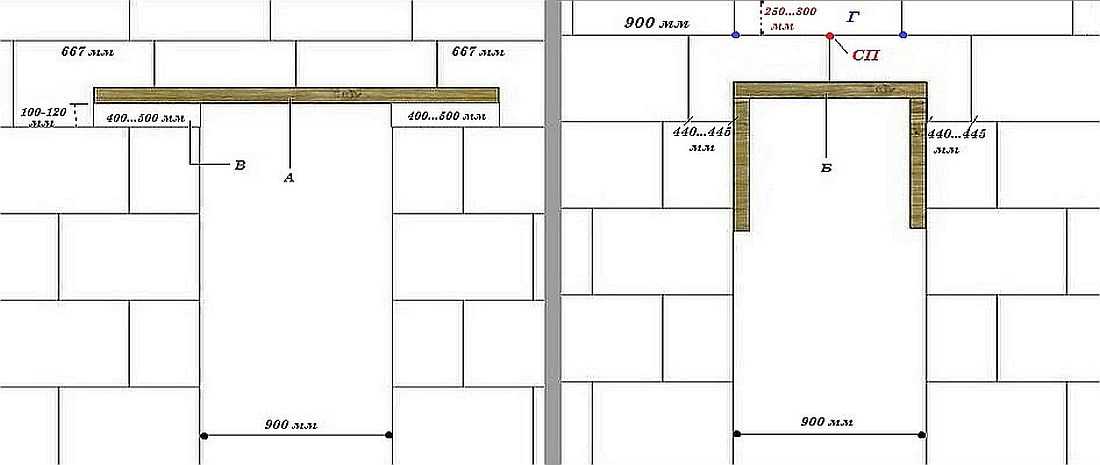 Pour des largeurs de porte jusqu'à 800 mm vous pouvez le faire sans cavalier. Dans ce cas, un support est réalisé et les blocs sont montés sur colle. Après séchage, le support peut être retiré. Il est important de disposer les blocs de façon à ce que la couture verticale était au milieu de la porte.