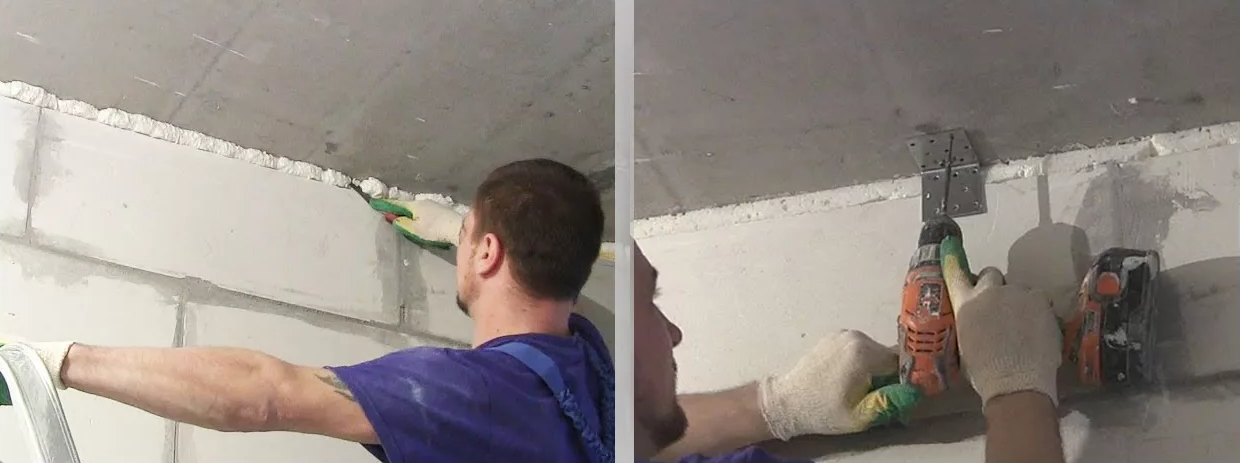 Une compensation est toujours laissée entre la cloison et le plafond. écart 1,5-2,5 cm de large... Il est moussé après avoir terminé la disposition du mur.