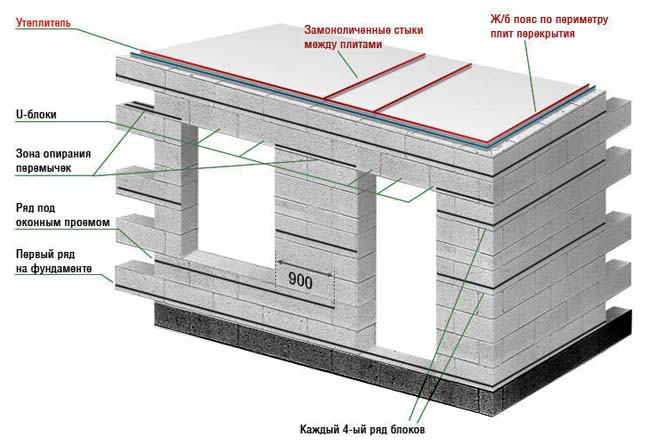 Le long du périmètre des murs des deux matériaux, une ceinture en béton armé est réalisée afin de supporter des dalles de plancher ou des poutres porteuses, des fermes dessus. Pour la pose de blocs de gaz et de blocs de mousse, un mortier ciment-sable ou une colle spéciale est utilisé. La première ligne est toujours placée sur une solution.