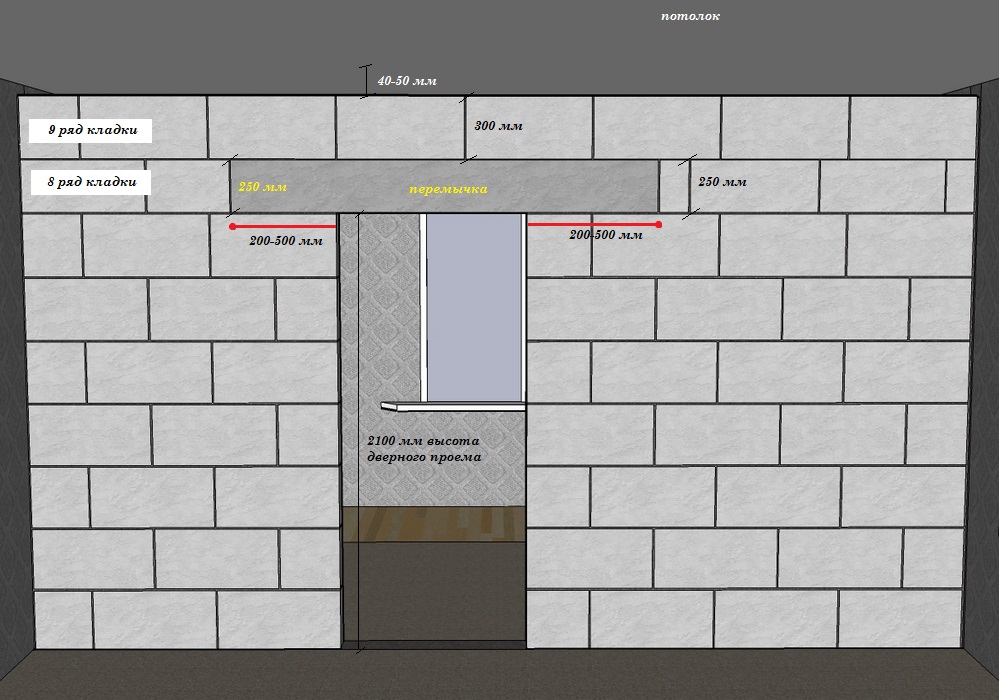 Pour placer des blocs sur des portes standard largeur de 600 à 800 mm utilisez un coin en acier avec des étagères de 30-50 mm. Les coins doivent être 50 à 60 cm plus longs que l'ouverture pour assurer une intersection sûre avec les murs de la cloison.