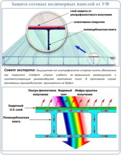 L'article 10 de GOST R 56712 établit les exigences d'installation et d'exploitation, dans lesquelles la variété cellulaire de polycarbonate durera longtemps sans perdre les caractéristiques techniques: