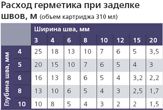 Les calculs sont effectués et manuellement: multipliez la longueur, la profondeur et l'épaisseur de la couture. Pour connaître le volume du mastic, diviser le volume du tube par la valeur obtenue.