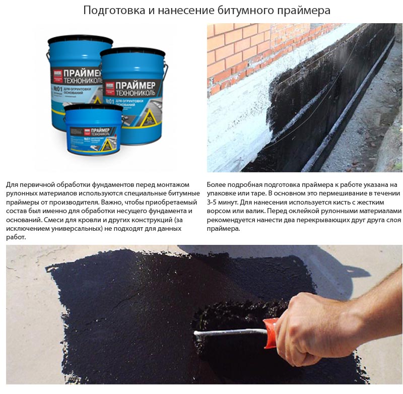 L'apprêt bitumineux est utilisé pour le béton, le métal, le bois, l'amiante-ciment, les blocs poreux. Il est utilisé comme isolation indépendante de l'humidité ou en combinaison avec d'autres matériaux.