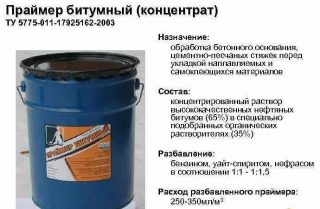 Primaires bitumineux prêts à l'emploi avant travaux pas besoin de se reproduire. Les concentrés sont dilués avec du kérosène, de l'essence, du white spirit, du solvant. Il est déconseillé d'utiliser des solvants à base d'acétone (n° 647, 646, etc.). Les formulations concentrées permettent d'économiser de l'argent sur le transport du produit jusqu'au site de traitement.