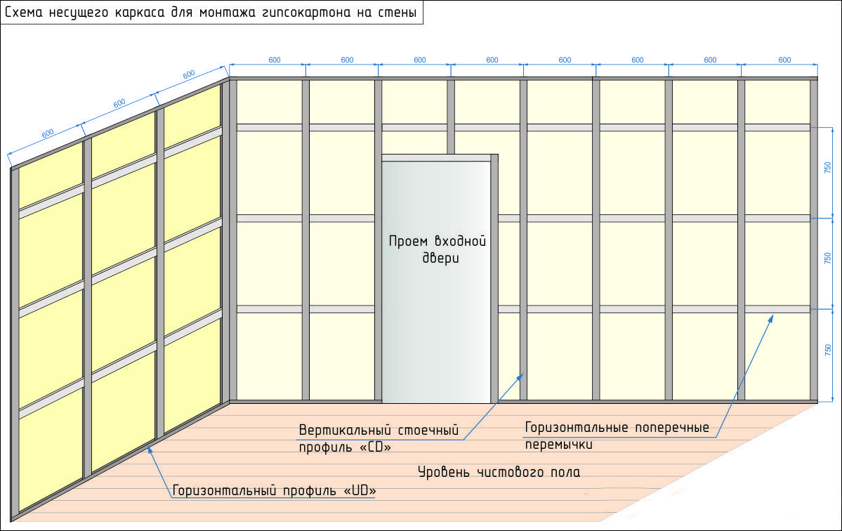 - Profil UD compter le long du périmètre du mur pour le cadre à un niveau. La valeur est multipliée par deux, avec un cadre métallique à deux niveaux.