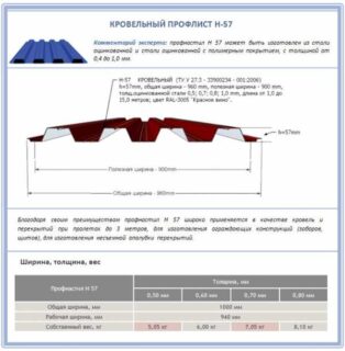 Le carton ondulé porteur est utilisé pour les couvertures de toiture à charge élevée, les toitures plates, les coffrages fixes, les chevauchements. La feuille professionnelle H57 se distingue par son prix abordable, sa popularité s'explique par des caractéristiques techniques positives et le choix. Les feuilles sont produites avec différentes couleurs, type de revêtement, largeur de feuille. Ils commandent la longueur requise pour un cas de construction spécifique.