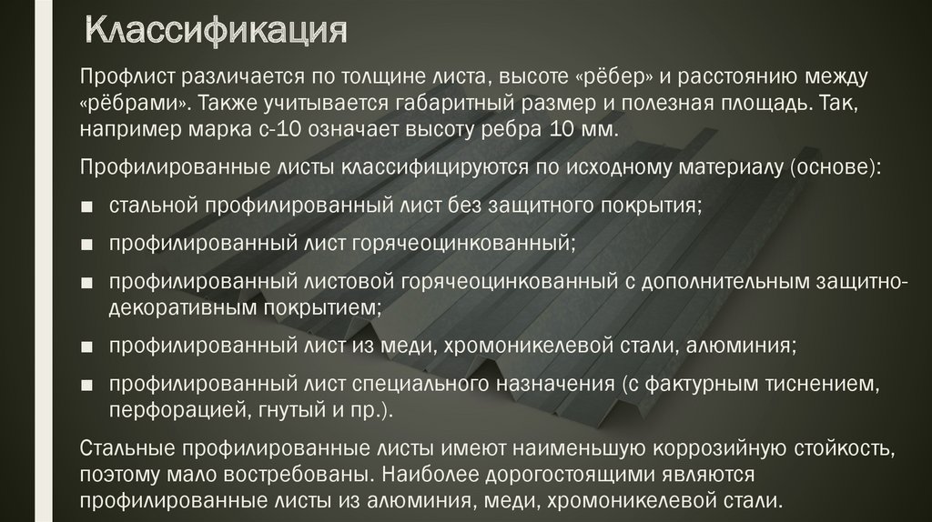 Les caractéristiques de la tôle profilée C10 dépendent de son type et de son mode de fabrication. Ils se distinguent par le type de couverture.
