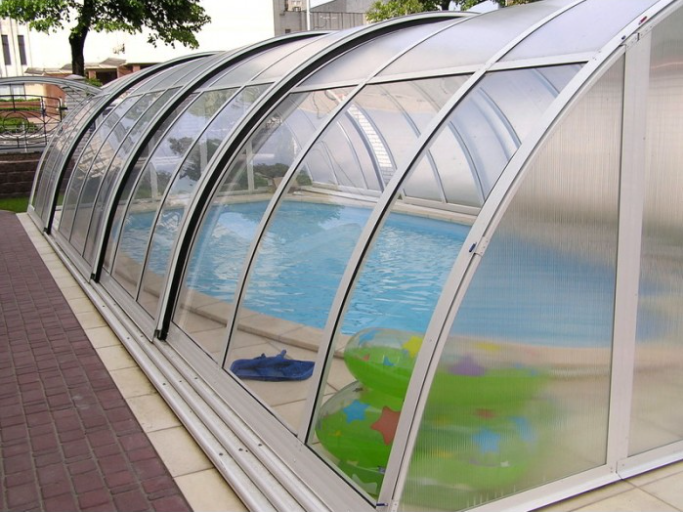 Pour les travaux de construction, ils utilisent moins de plastique de haute qualité, mais plus abordable. Cependant, en raison de sa résistance extrêmement élevée et de son manque de fragilité, le champ d'application du matériau est beaucoup plus large. Le polycarbonate coloré vous permet de créer une variété de motifs décoratifs.
