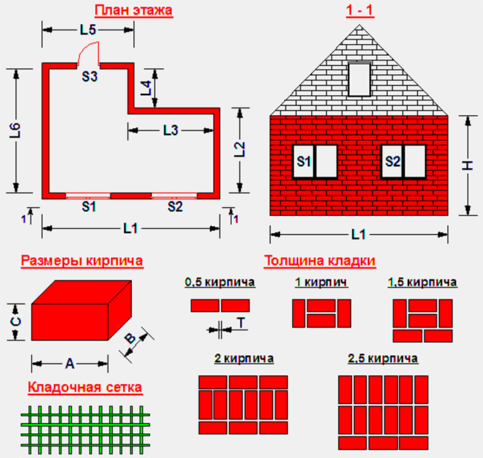 Les calculs pour chaque étage sont effectués séparément s'il existe des différences de plancher dans la maçonnerie des murs ou si une taille de brique différente est utilisée, par exemple, la transition de blocs de briques doubles à un et demi ou simple.