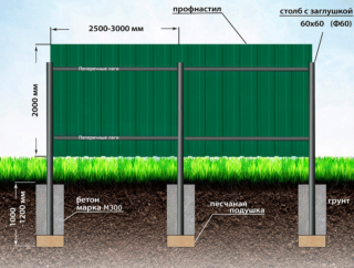 Les veines entre les piliers sont constituées d'un tuyau de 40x20 mm ou d'une planche de 100x20 mm. Pour une clôture d'une hauteur de 200 cm, ils mettent 3 guides, pour les structures en dessous, 2 traverses suffisent.