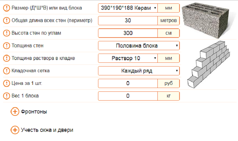 Le calcul par superficie est également fait, seulement ils ne déterminent pas le volume des murs, mais leur superficie. Le résultat obtenu est divisé par la surface d'un bloc du côté qui se tiendra dans le plan.Le résultat du calcul est multiplié par un facteur 1,1 pour tenir compte des coupes et des déchets.