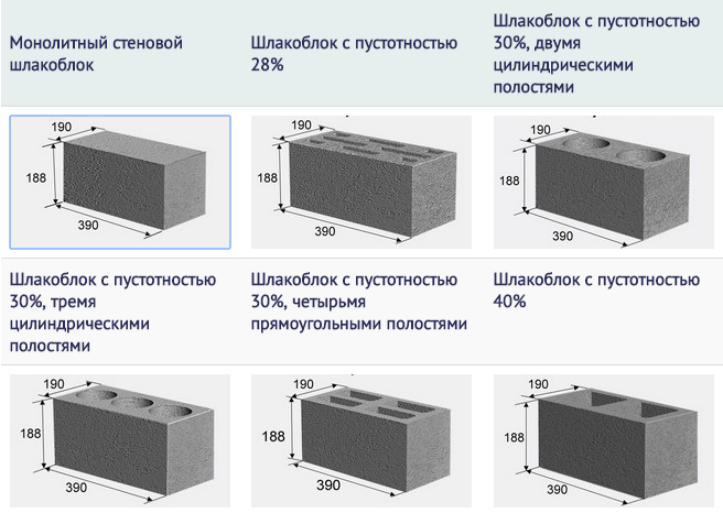 - Blocs creux et solides. Les deux types sont utilisés dans la construction, en fonction de la résistance requise pour le projet. Les pierres creuses allègent considérablement le poids des cloisons, des murs et des produits solides fonctionnent bien dans la construction de la fondation, la base de la maison.