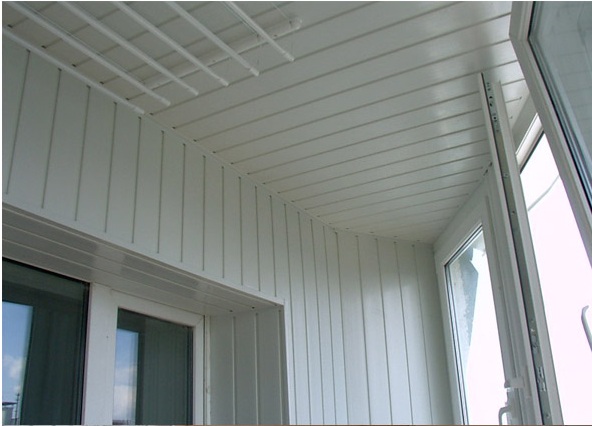 - Balcon et loggia. Ce sont des endroits extrêmes à tous égards. Ils sont exposés à la chaleur et au froid, à l'humidité, au vent et aux rayons ultraviolets. N'oubliez pas les oiseaux et les insectes. La meilleure solution est le vinyle qui peut résister à ces facteurs. Des lattes en acier peuvent être posées dessus. Si l'objet est vitré et chauffé, il n'y a aucune restriction sur la finition.