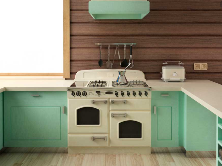 - Cuisine. Il y a de l'humidité et des changements de température importants ici, mais tout cela est à une échelle non critique. Par conséquent, il est possible d'appliquer les panneaux par zone - métal sur le bureau, plastique à l'opposé du poêle et de l'évier, et installer un parquet en bois à d'autres endroits.