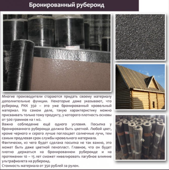 - Bitume réfractaire - avec ajout de résines polyester et de caoutchoucs synthétiques. Cette couche empêche la pénétration de l'humidité, augmente la résistance aux basses et hautes températures. La couche supérieure de bitume empêche la fissuration et donne une certaine souplesse et ductilité au matériau de couverture.