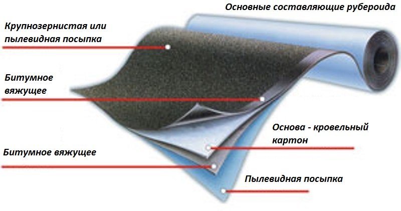 Le matériel déposé. La base est en fibre de verre ou en fibre de verre, ce qui augmente la résistance et la densité de la toile. La base est imprégnée de bitume purifié enrichi d'additifs polymères. L'aspersion inférieure est généralement du sable, la partie supérieure - des copeaux minéraux.