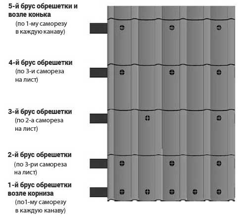 Application de tôles profilées pour couverture de toit nécessite de conférer au matériau des propriétés d'étanchéité et de résistance aux charges de vent. Pour cela sont utilisés attaches spéciales pour carton ondulé et un petit pas du cadre. La crête est fixée avec de longues vis.